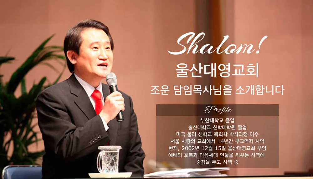 조운 목사는 복음의 불모지인 울산 땅을 하나님의 거룩한 도시로 변화시키고자 끊임없는 도전을 하고 있습니다. 울산을 성시화하고 시대를 감당하는 교회로 하나님께서 대영교회를 지목하셨다는 확신으로 사역하는 조운 목사는 대영교회가 울산뿐 아니라 이 나라와 민족을 품고 세계를 감당하는 교회가 되길 위해 기도하고 있습니다.